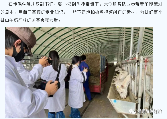 3月2日,传媒学院与富平县文旅局展开校地合作;3月12日,学院领导到富平杰羊农牧科技有限公司考察;学院与富平文旅局、杰羊农牧科技有限公司就短视频创作及传播达成合作意向。3月30日下午,渭南师范学院“影动传媒短视频服务队”走进富平杰羊农牧奶山羊有机牧场,开展“富平山羊奶,强壮中国人”主题短视频服务社会活动,助力乡村振兴。