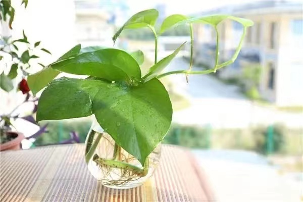 绿萝四季常青,叶片宽大,有治跌打扭伤、净化空气的功效。喜湿热的环境,喜散射光,忌阳光直射,喜阴,喜富含腐殖质、疏松肥沃的土壤。