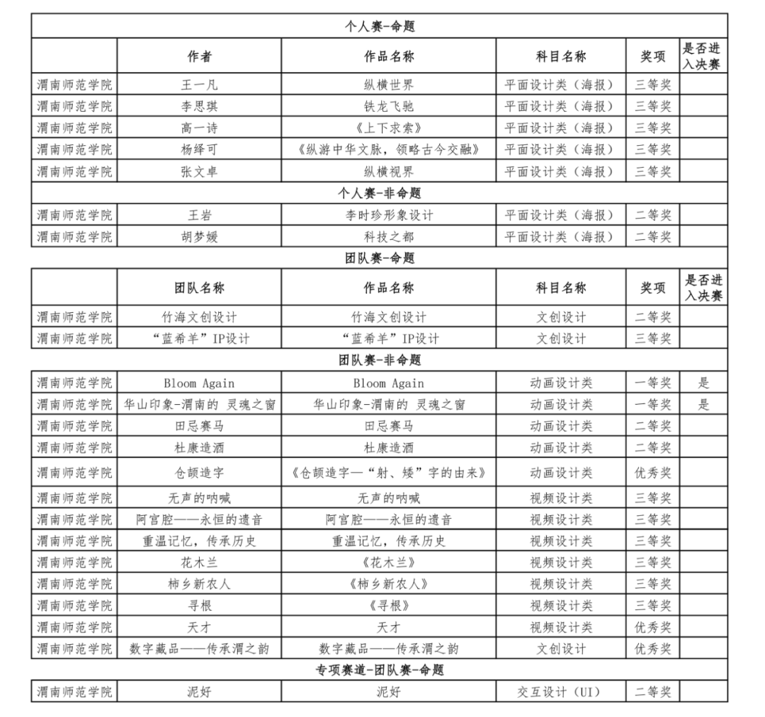 大赛自启动以来,在教务处大力支持下,学院精心组织,师生积极参与。学院共征集到了110余件参赛作品,并从中选拔出了30件优秀作品参赛。2项省级一等奖入围全国总决赛,这不仅使对创作团队才能的褒奖,也是对学院教学质量和学生培养成果的肯定。、