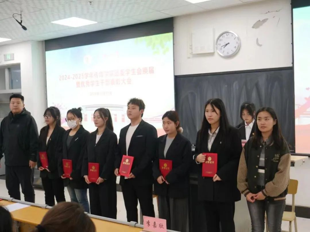 随后,崔哲老师宣读关于表彰2023-2024学年优秀团干部、优秀学生干部的决定,并与李嘉欣老师为他们颁发荣誉证书。