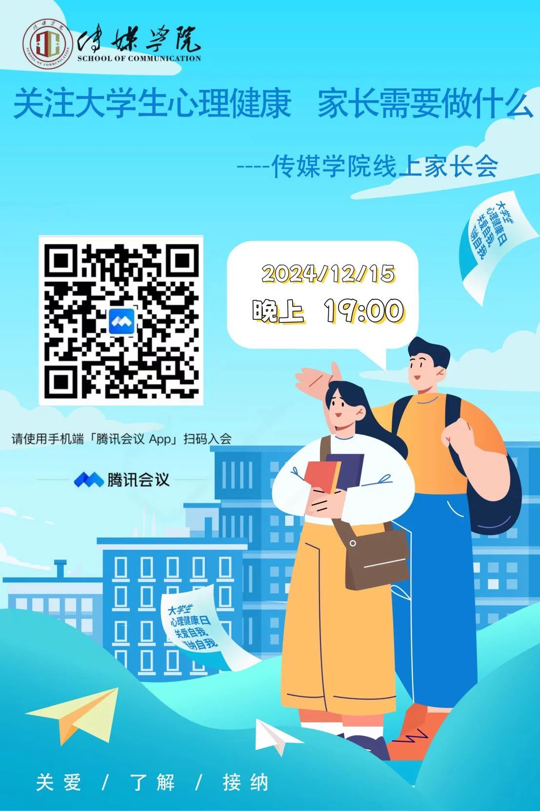 12月15日,传媒学院组织开展“家校共筑心桥 携手呵护成长”线上心理家长会,学院心理专干李嘉欣担任主讲人,约120名家长参加会议。李嘉欣向家长讲述了大学生在大学期间可能面临的心理健康问题及原生家庭教育对孩子心理健康产生的影响,呼吁家长在日常生活中多多关注学生的心理状态,共建家校沟通桥梁。