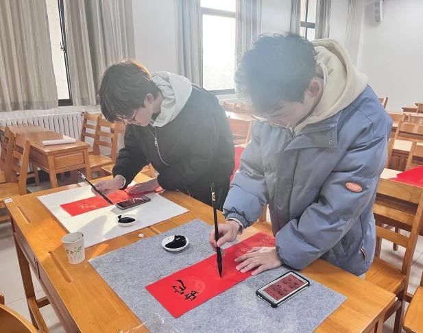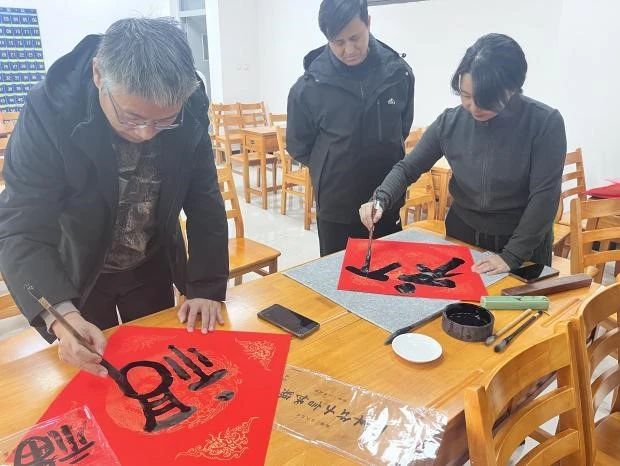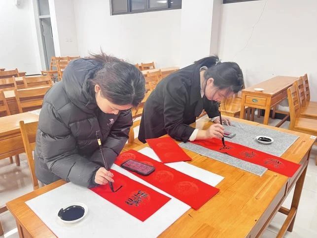 活动现场,墨香四溢,红纸翻飞,师生们齐聚一堂,纷纷挥毫泼墨,一展书法技艺。有的笔法苍劲有力,有的字迹灵动活泼,每一副春联都饱含着对新年的美好憧憬和祝愿。