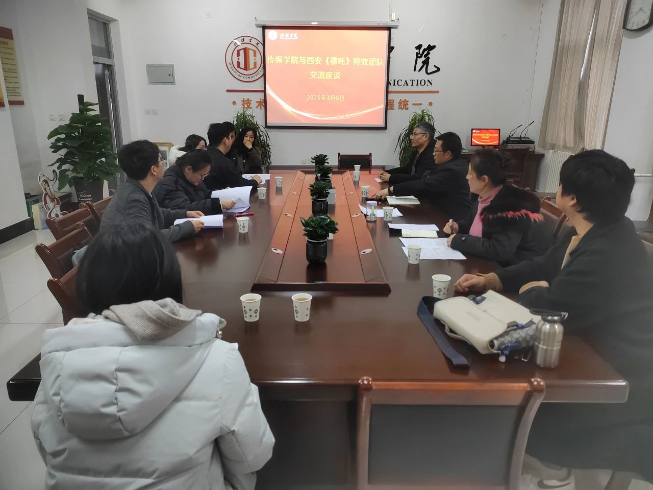 报告会结束后,传媒学院教师与特效团队就数字媒体类专业本科人才培养方案进行了座谈交流。宋兴华从优化专业三维特效课程体系、强化实践教学环节等方面提出了建设性意见。他强调,应着重培养学生的团队协作能力、项目管理能力和沟通表达能力,并通过参与实际项目提升学生的综合素养。他表示,公司愿意与学院建立长期稳定的合作机制,通过共建课程、共建实习基地等方式,为学生提供更多接触真实项目的机会,提升就业竞争力。