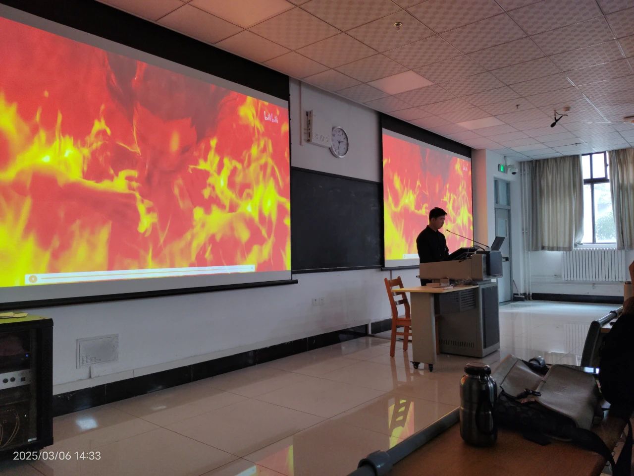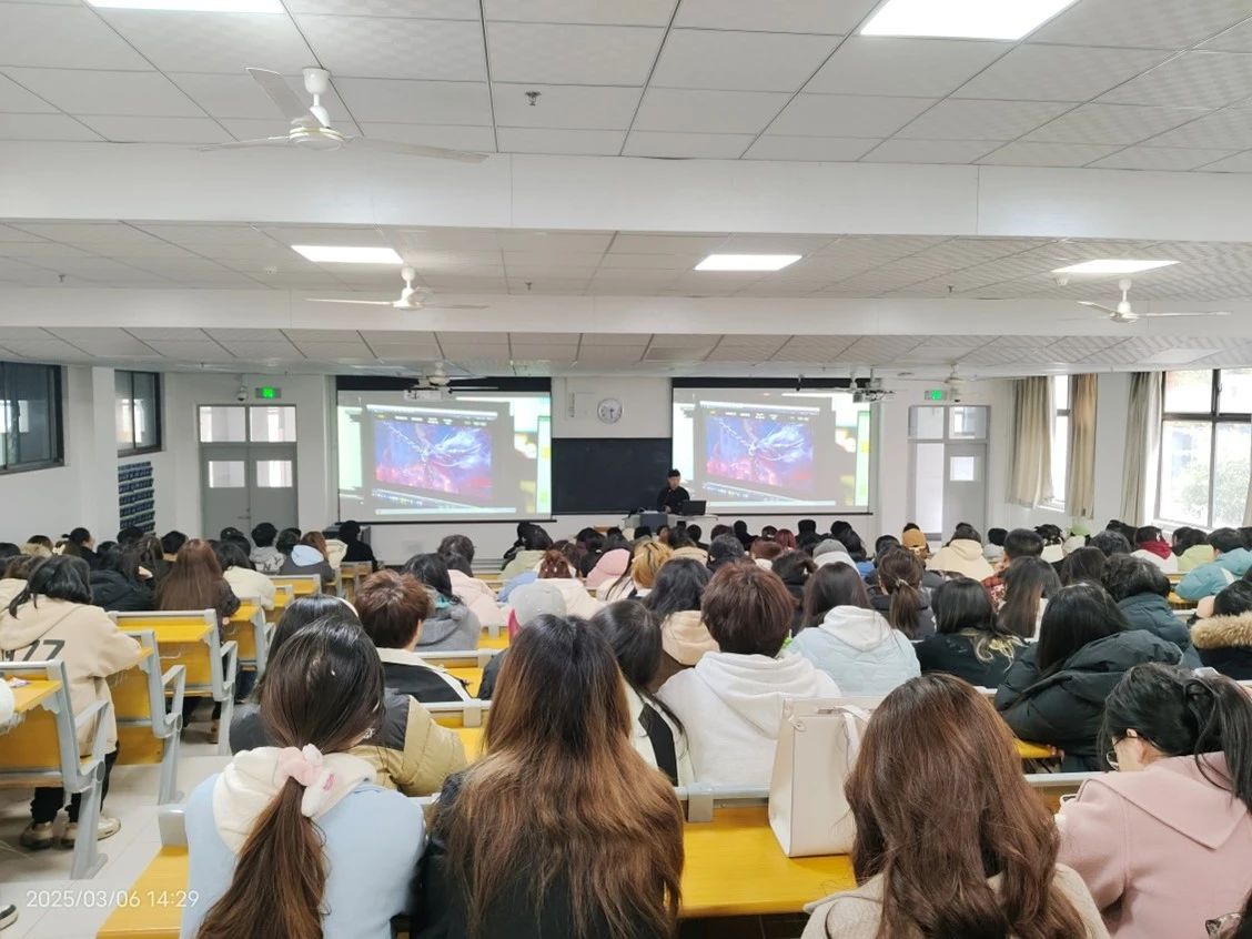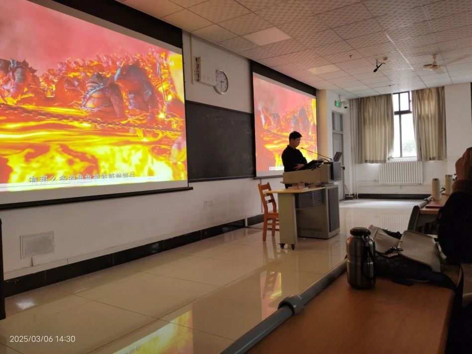 专题报告中,宋兴华总监以2025年现象级影视动画的作品《哪吒之魔童闹海》为切入点,详细讲述了了海底龙宫坍塌,无数海妖从岩浆中涌出、哪吒回陈塘关的环境、敖丙和哪吒分道扬镳等场次特效渲染合成技术流程,分享团队在制作上不断精细打磨,力求将每一个画面、每一个动作都雕琢到极致的过程。同时,宋兴华总监还结合公司近年来在游戏CG、电影广告视效、裸眼3D等领域的成功项目案例,分析当下数字文化产业的发展趋势,为师生打开了一扇了解行业最新动态的窗口。