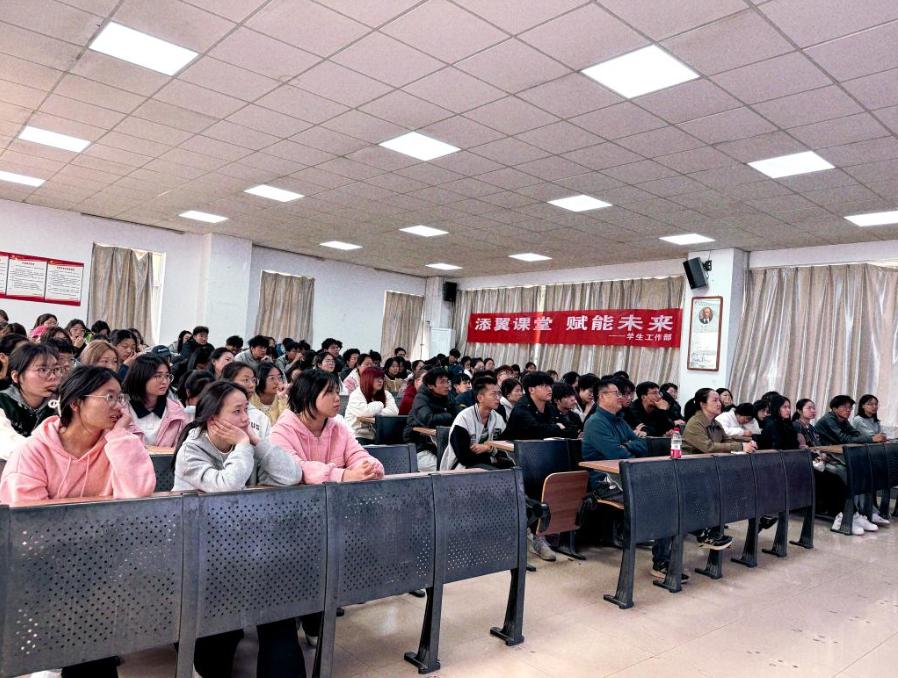 4月2日下午,学生工作部(处)在1101教室举办"添翼课堂”活动。传媒学院孟丽花教授受邀为140余名家庭经济困难学生带来《一堂电影课》专题讲座,讲座由学生工作部(处)副部长马耀斌主持。