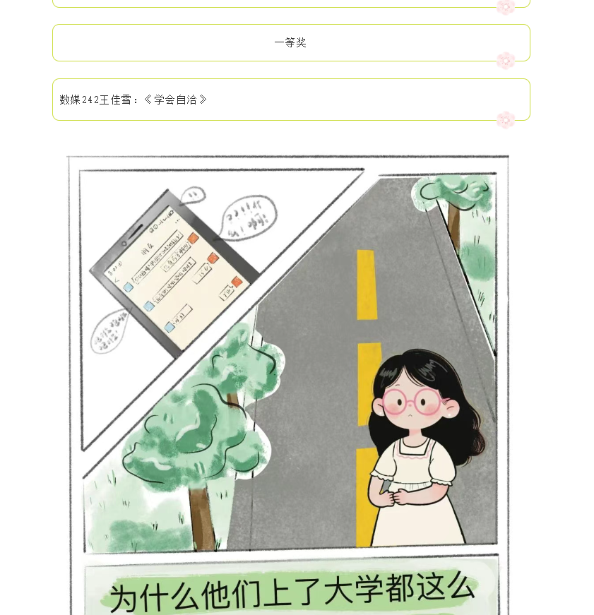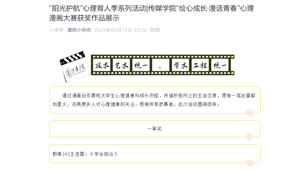 4月25日-5月15日,传媒学院举办“绘心成长·漫话青春”心理漫画大赛,通过漫画创作展现大学生心理健康与成长历程,传递积极向上的生活态度,提升学生艺术表达与心理调适能力。此次活动共收到心理漫画作品40余份,最终评选出10幅优秀作品在学院公众号中进行展示。