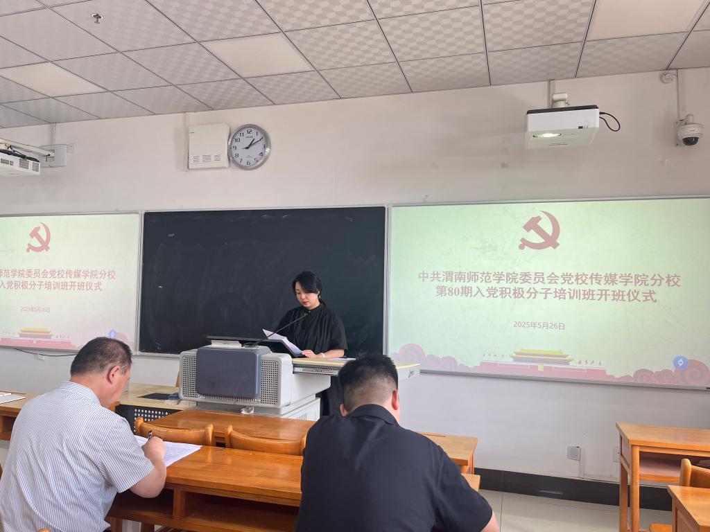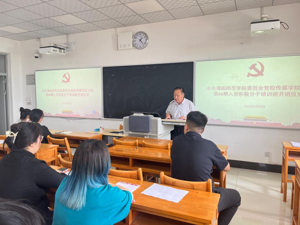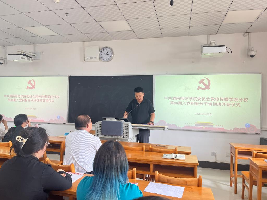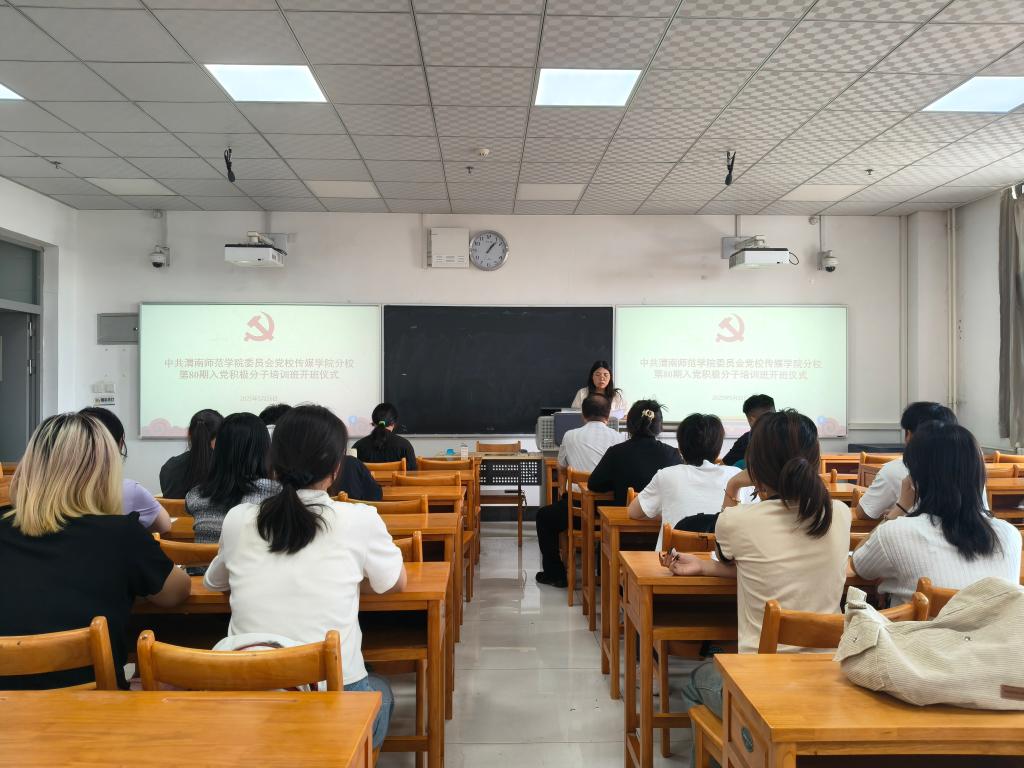 为进一步提高入党积极分子的政治素质和理论修养,确保新发展党员质量,传媒学院分党校于2025年5月26日在教学楼1106教室举办第80期入党积极分培训班开班仪式。党总支书记田康顺、副书记周双、师生融合党支部书记崔哲、全体辅导员及13名入党积极分子参加开班仪式,会议由党务秘书侯美颖主持。