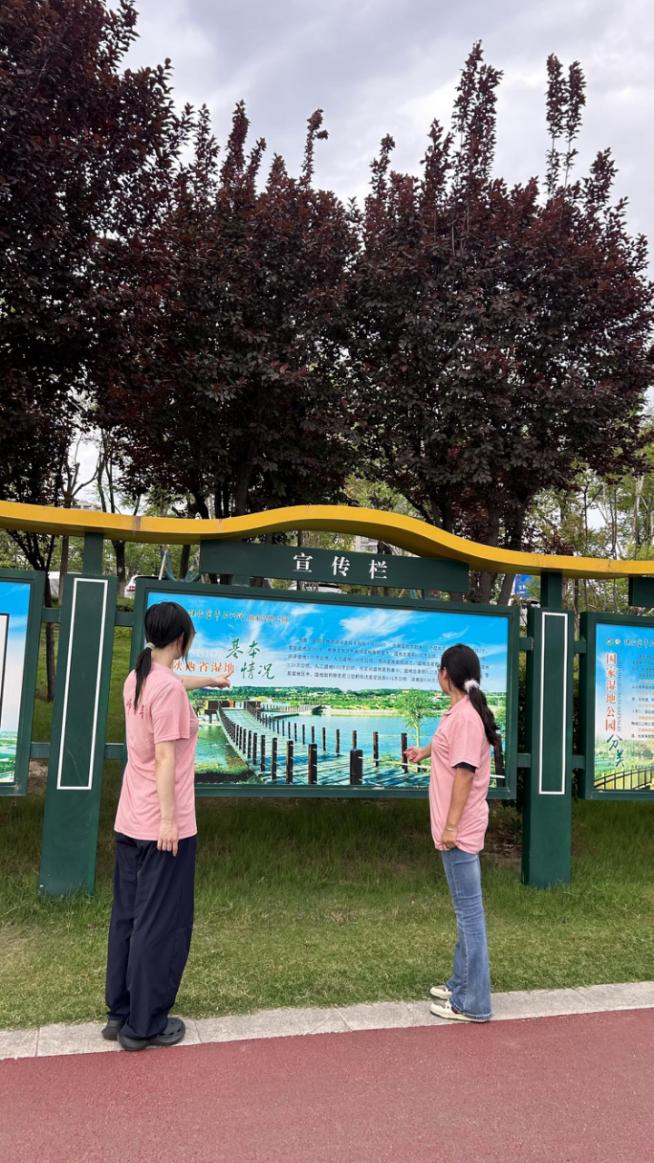 宣传栏前,张梦菲同学(右)和段李祯同学(左),他们正在认真阅读关于生态湿地知识的内容。这不仅是自我学习,更是为向更多人传递生态保护理念做好准备,努力让生态知识走出宣传栏,融入大众日常。