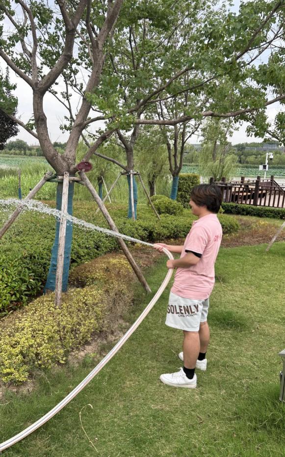 公园的树木是城市的绿色守护者,刘薛涛同学手持水管,为树木送去清凉甘霖。每一道水流,都是对生命的滋养,让葱郁枝叶在阳光下愈发鲜亮,助力公园生态系统良性循环,为市民的休闲娱乐,营造更清新的环境。