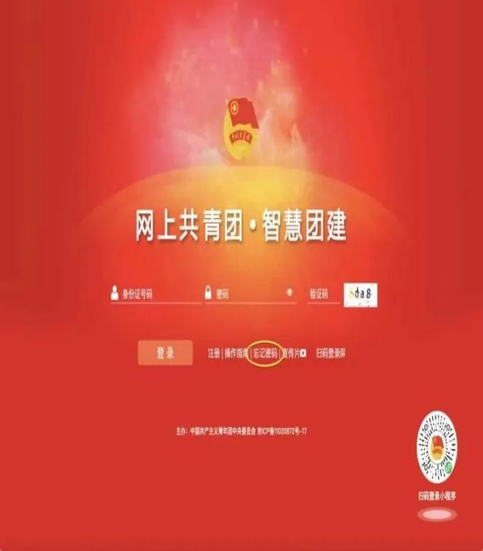 c.若显示身份证或密码错误,请联系毕业院校确认本人是否已被录入“智慧团建”系统。若未录入则需点击注册进行注册;若确认在系统内,联系毕业院校管理员生成[密码重置码],拿到[密码重置码]后打开系统首页选择“忘记密码”,按照页面提示自主操作即可。