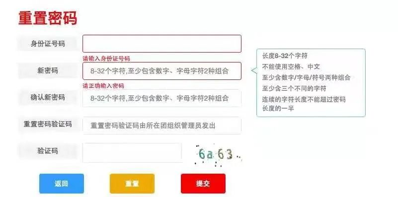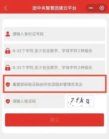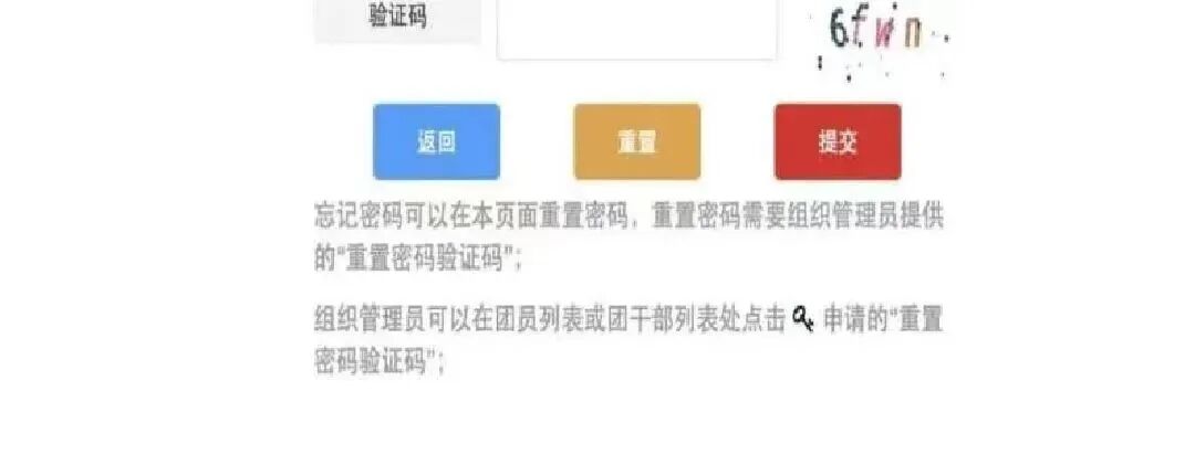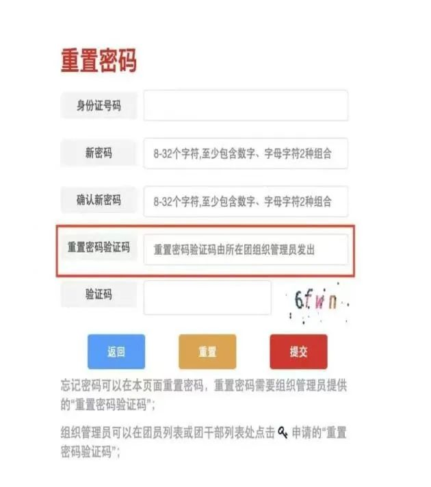 答:如果你是团支书,请联系高中负责智慧团建的管理员,获取改密码的验证码;如果你不是支书,请联系管理员(团支书、副书记、宣传委员、组织委员) 发送重置验证码进行重置。